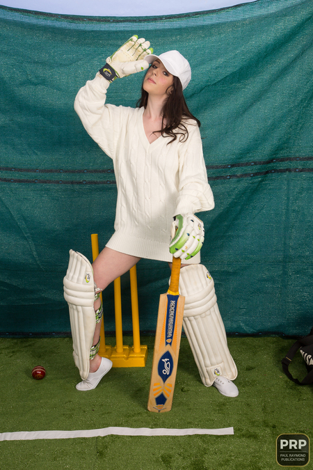 So we’ve already given a nod to British footie clubs’ success this issue, but hey – it is the middle of summer now, which means it’s time for cricket – and a Cricket World Cup and an Ashes series, in fact! To be honest though, going by Rebecca’s rather vintage kit it doesn’t look like she’s bang up to date with cricketing matters, but caps off for trying… “No, to be honest cricket isn’t really my thing , although one of the best nights of my life did involve six balls! I certainly wasn’t a maiden by the end of it, I can tell you!”